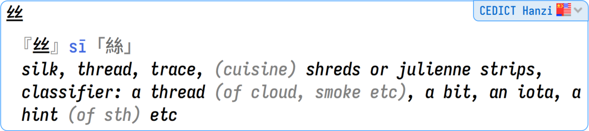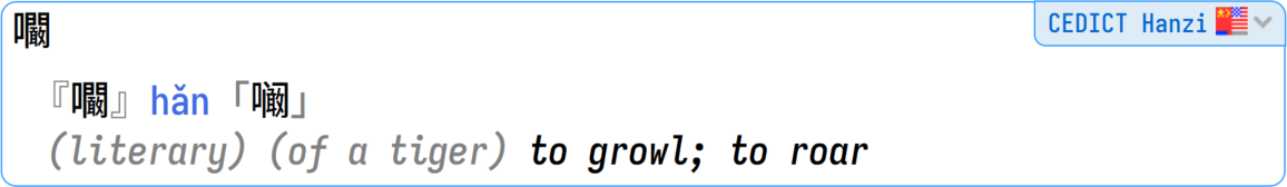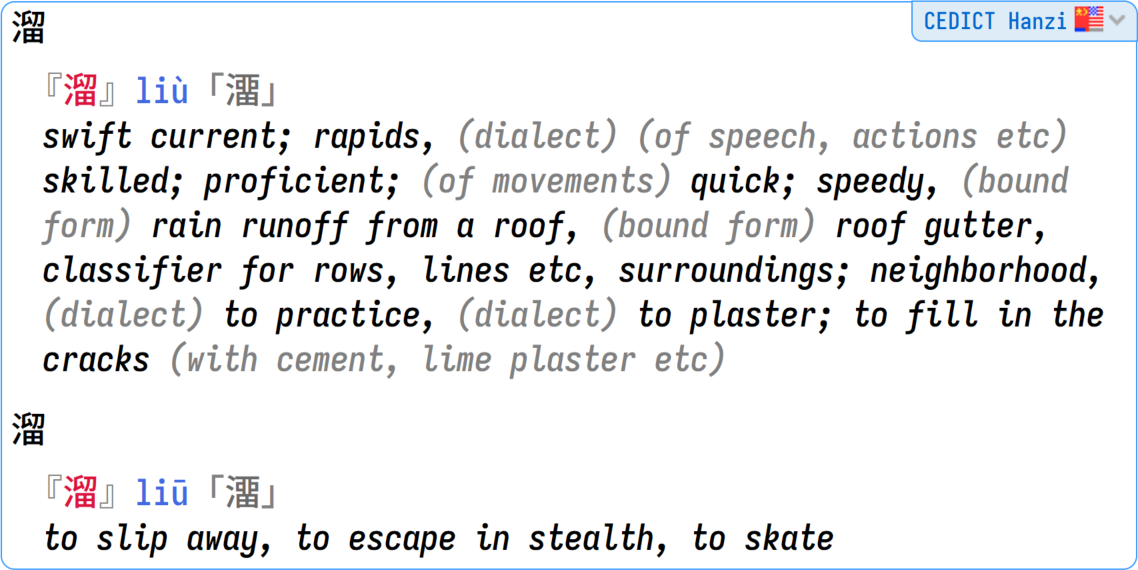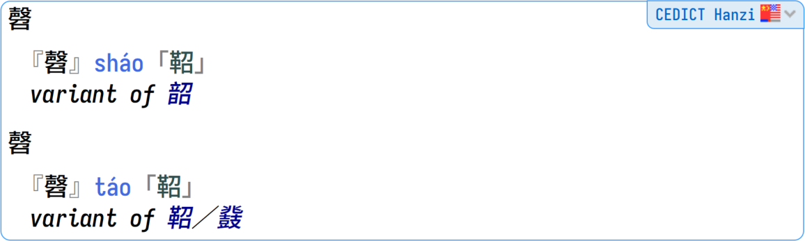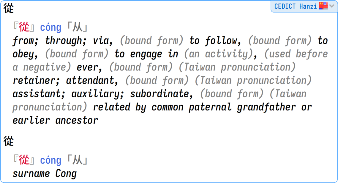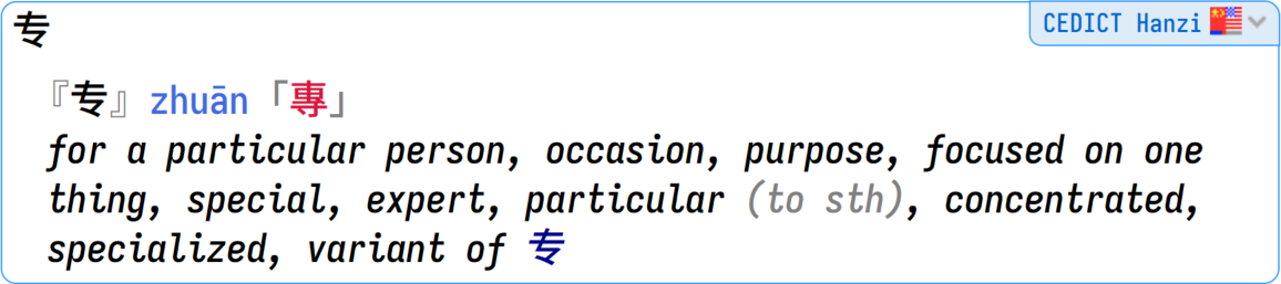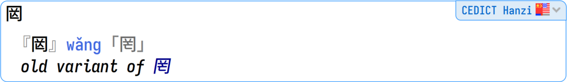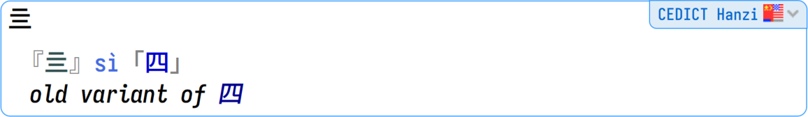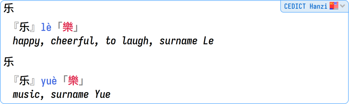 CEDICT Hanzi is our edition of the famous CC-CEDICT (Chinese to English Dictionary), but with only the hanzi filtered. It has all the pinyin readings for the Chinese characters, and all the alternative hanzi. This is your "fourth opinion" (along Hanzidic) in case you want to compare results with the other kanji dictionaries.