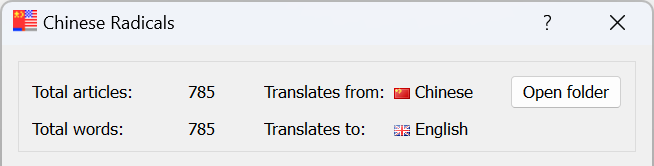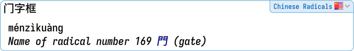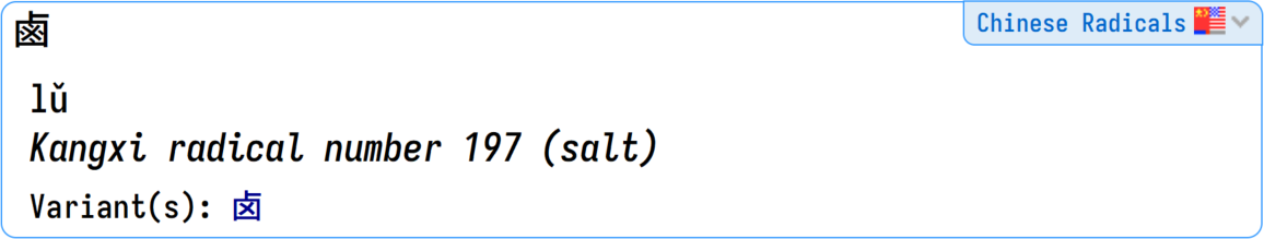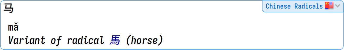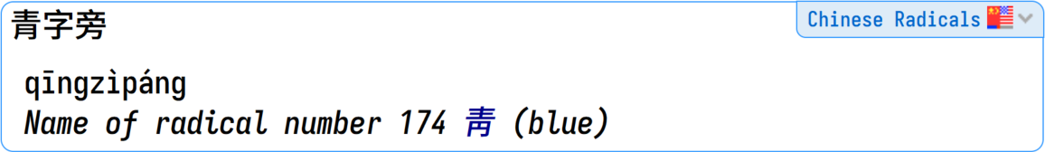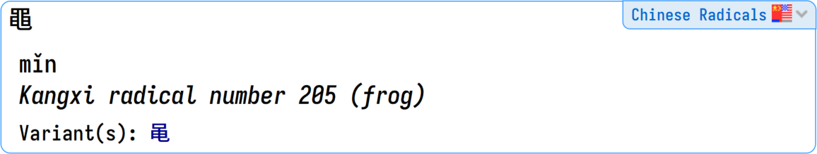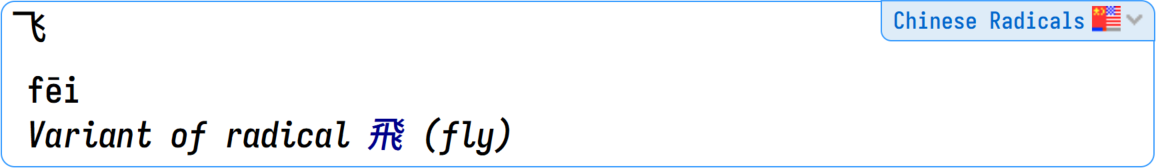 Chinese Radicals is our most extensive dictionary of radicals. It contains all the radicals, their variants, their names, along with their readings. Can be searched by radicals or any of their variants:
